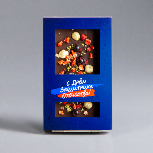 Тёмный шоколад с клубникой, чёрной смородиной, фисташками и фундуком, синяя коробочка #1