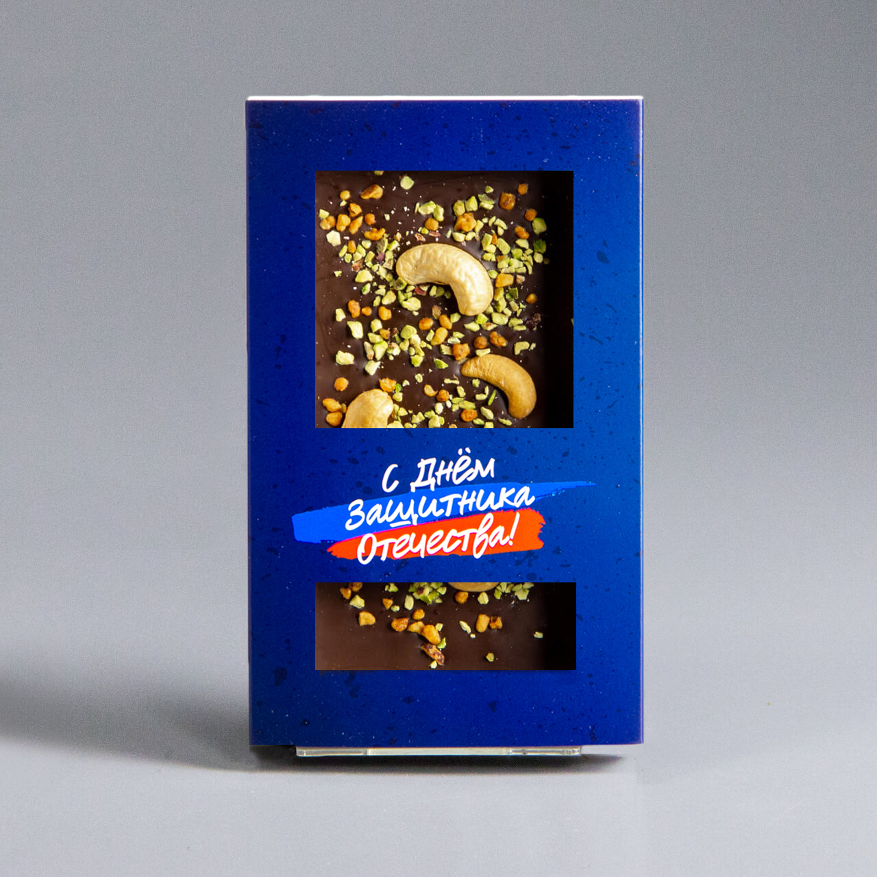 Тёмный шоколад с жареным кешью, карамелизированным фундуком и фисташками, синяя коробочка #2