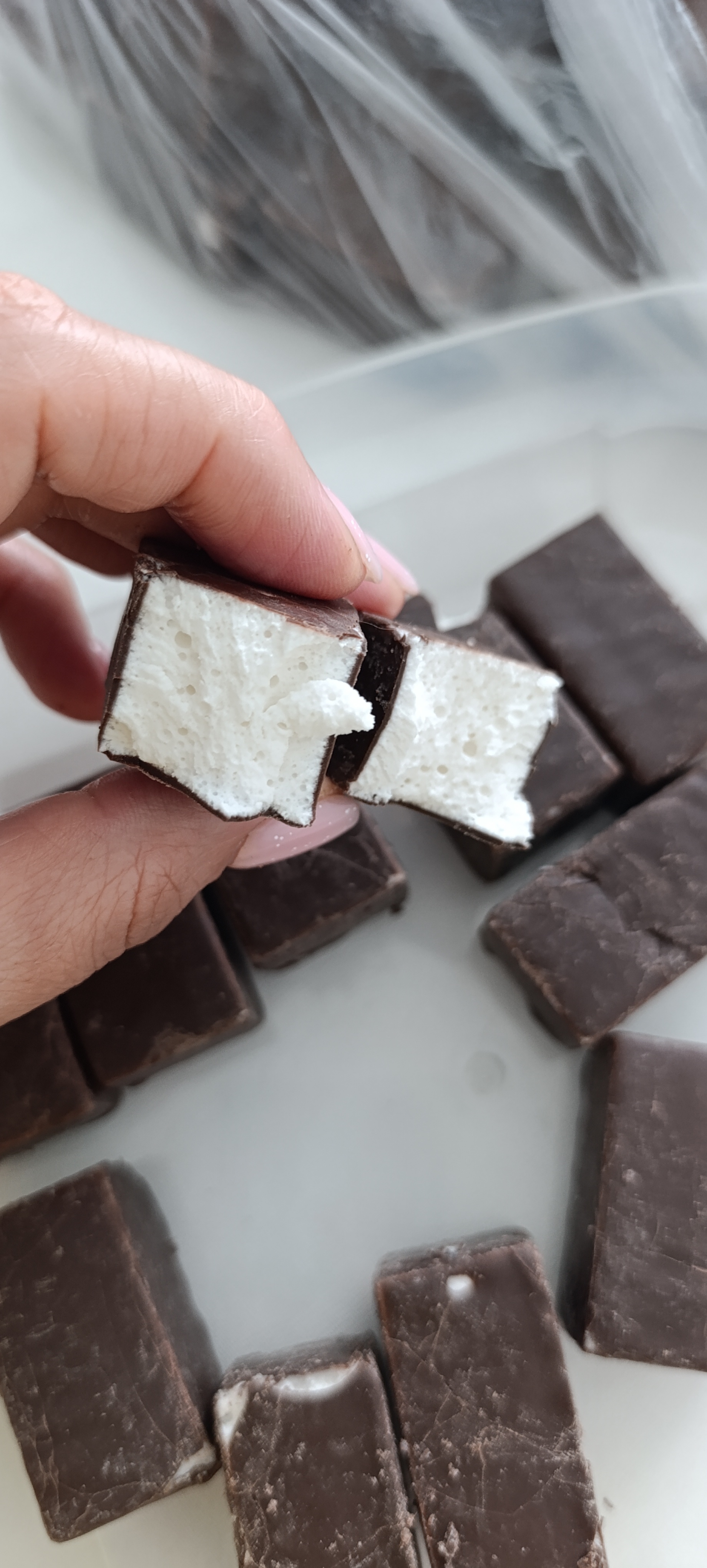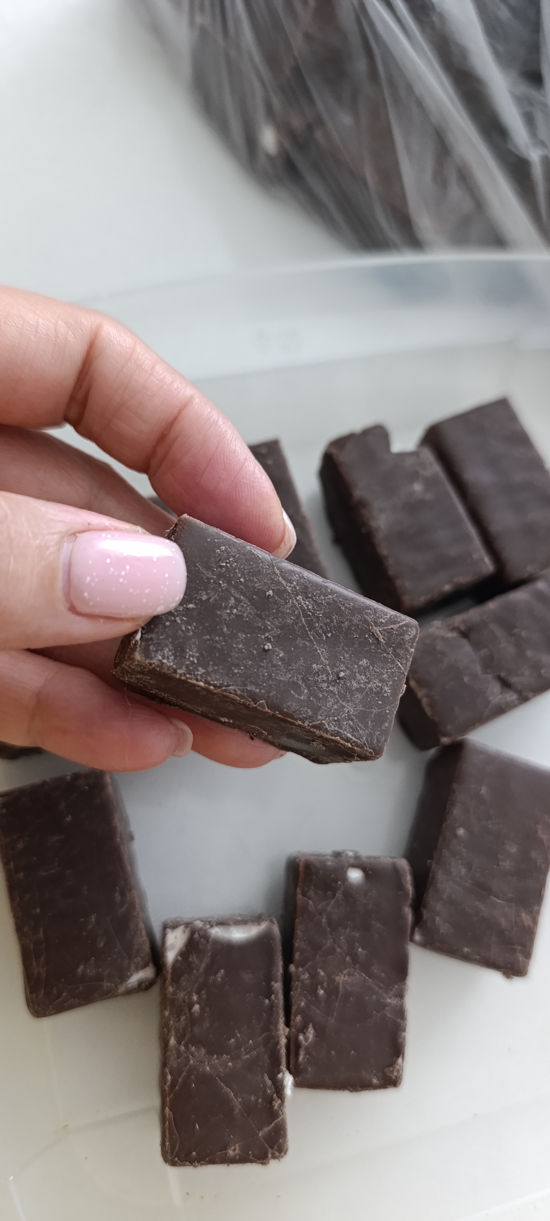 Не понятно из чего это сделано, но точно ничего натурального в составе нет. Это не шоколад, это- пластилин. К сожалению, видео подгружать нельзя. Залив этот, якобы, шоколад теплой водой, видим, что он даже и не думал таять. Потерев кусочек двумя пальцами, он так и остался этим кусочком, даже не начав размягчаться, не испачкав при этом пальцы. При укусе, эта "шоколадная" масса моментально прилипает на зубы. Ужас. Не советую. Очень сомнительное качество.