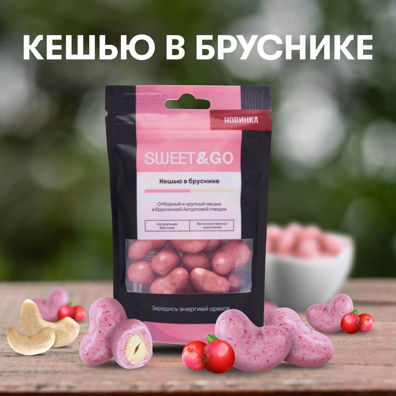 Конфеты в брусничной глазури с цельным кешью Sweet&Go (Дойпак) 80гр