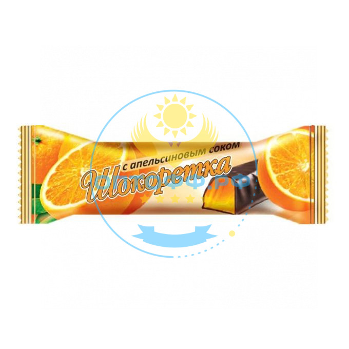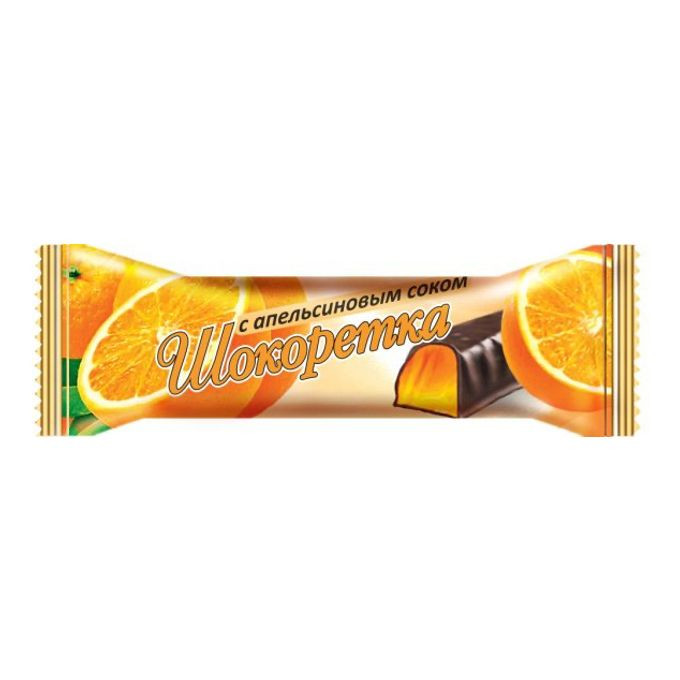 Желейная конфета в форме дольки, покрыта шоколадной глазурью. Корпус конфеты — желе с натуральным соком апельсина.