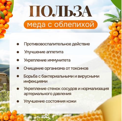 Крем-мед с облепихой – это возможность насладиться нежной текстурой и насыщенным вкусом. Мед-суфле идеально сочетает сладость алтайского меда и пикантную кислинку ягод облепихи. Этот природный эликсир - настоящий кладезь витаминов и полезных веществ.