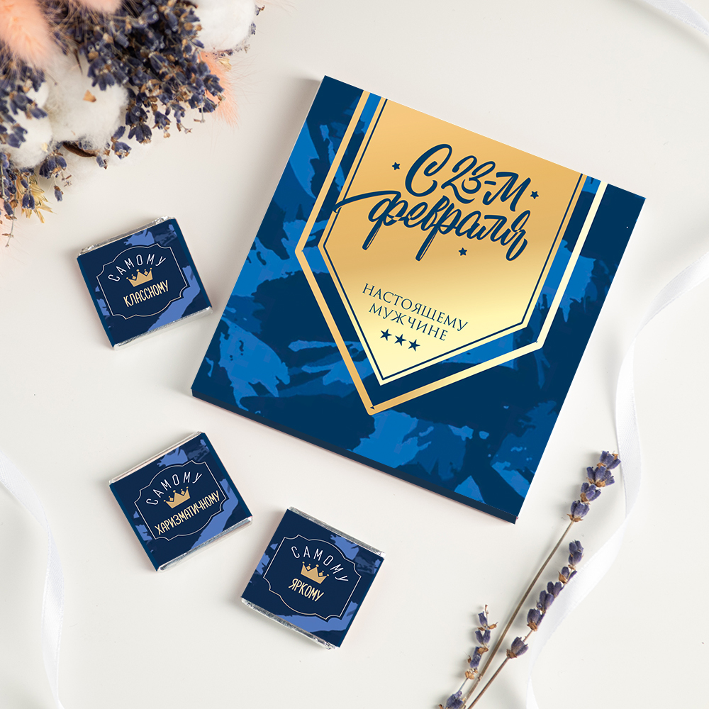 Набор 9 шоколадок "С 23-м февраля настоящему мужчине" (синий камуфляж)