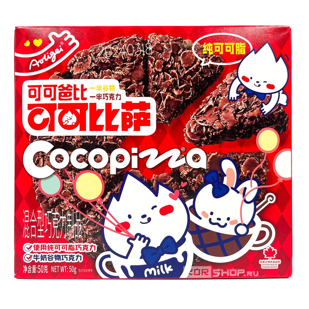 Злаковое печенье «Шоколадная пицца» с молочным шоколадом – необычный формат печенья, состоящего из сладких кукурузных хлопьев в нежном шоколаде. Печенье имеет форму ломтиков пиццы, чем сразу поднимает настроение и создает предвкушение удовольствия. Хрустящая текстура хлопьев замечательно подчеркивается нежной мягкой шоколадной массой. Такое лакомство – отличный знак внимания любителю нестандартных сладостей, который будет рад новым вкусам и ощущениям. Веселое мультяшное оформление упаковочной коробочки позволяет использовать печенье как подарок на детский праздник или сладкий гостинец любителю азиатских лакомств.
