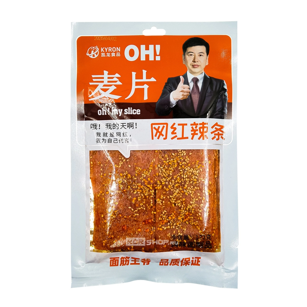 Пряные снеки латяо Maipian Mianjinwangye Kyron – знаменитая китайская закуска из пшеничной муки с добавлением острого чили-масла, кунжута, соли, жгучего перца и богатого набора пряностей. Китайские латяо могут иметь самые разные формы, от лапшинок и полосочек до ромбиков, завитушек и ломтиков. Этот вариант латяо выполнен в форме слайсов, которые, в отличие от соломки, имеют гораздо большую площадь соприкосновения с вкусовыми рецепторами на языке и потому доставят намного больше удовольствия любителям этой традиционной китайской закуски. Снеки латяо очень жгучие и станут фаворитами у ценителей «огненных» угощений.