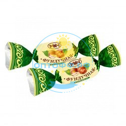 Карамель с пралиновой начинкой с добавлением ореха фундука и какао порошка.