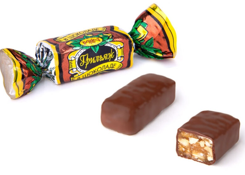 Грильяжная масса из арахиса, глазированная шоколадной глазурью.