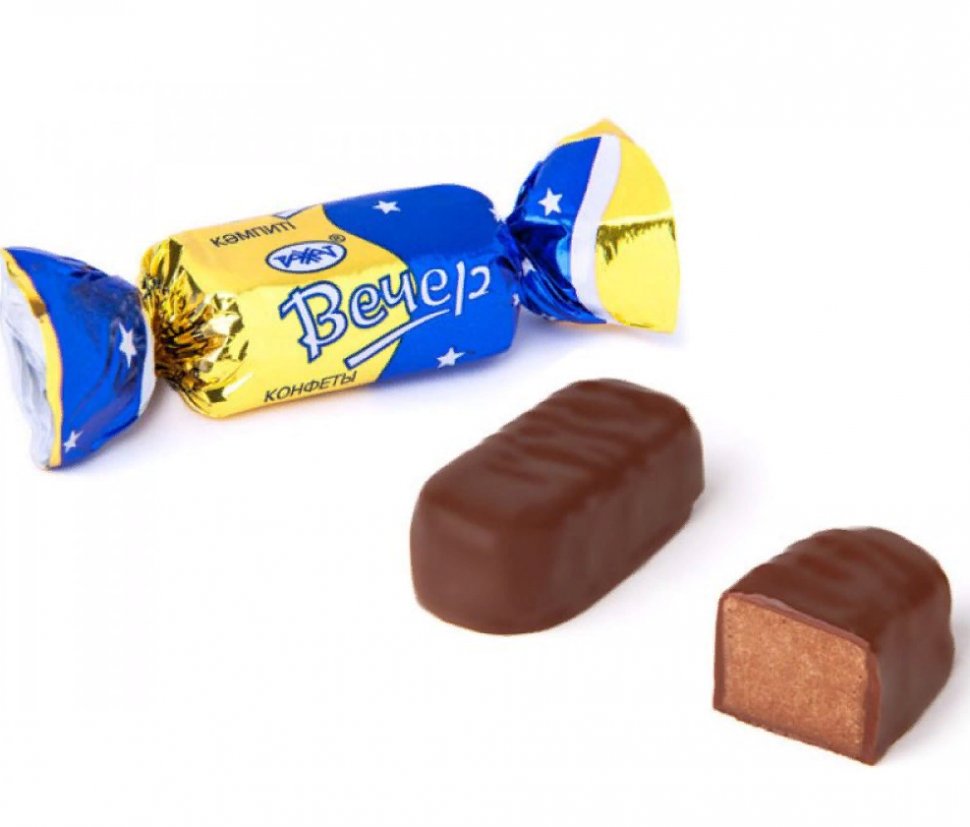 Конфеты ЗВЕЗДЫ АЛМАТЫ (ВЕЧЕР) глазированные со сливочным помадным корпусом крем-брюле с большим содержанием цельного сгущенного молока и натурального сливочного масла, с добавлением спирта и ягодной настойки. Конфеты изготовлены на кондитерской фабрике АО "РАХАТ", Казахстан.