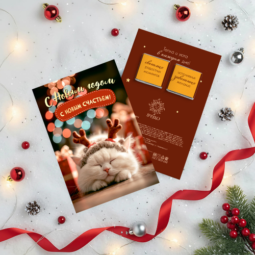 Открытка 2 шоколадки "С Новым годом, с новым счастьем (белая кошечка)"
