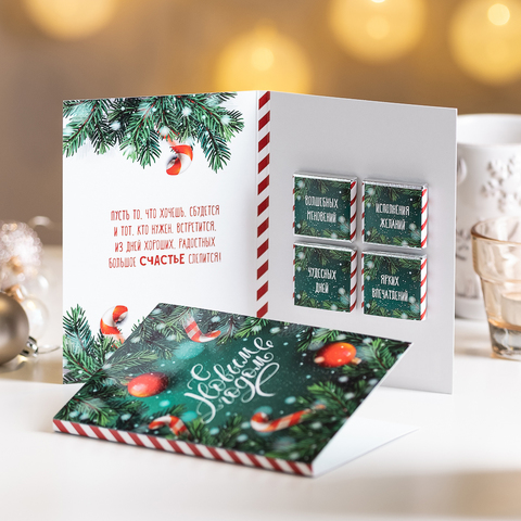 Внутри открытки - 4 шоколадки (вес каждой шоколадки: 5 г., размер: 31 х 31 мм.)