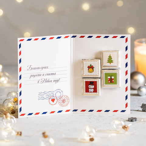 Внутри открытки - 4 шоколадки (вес каждой шоколадки: 5 гр., размер: 31 х 31 мм.)