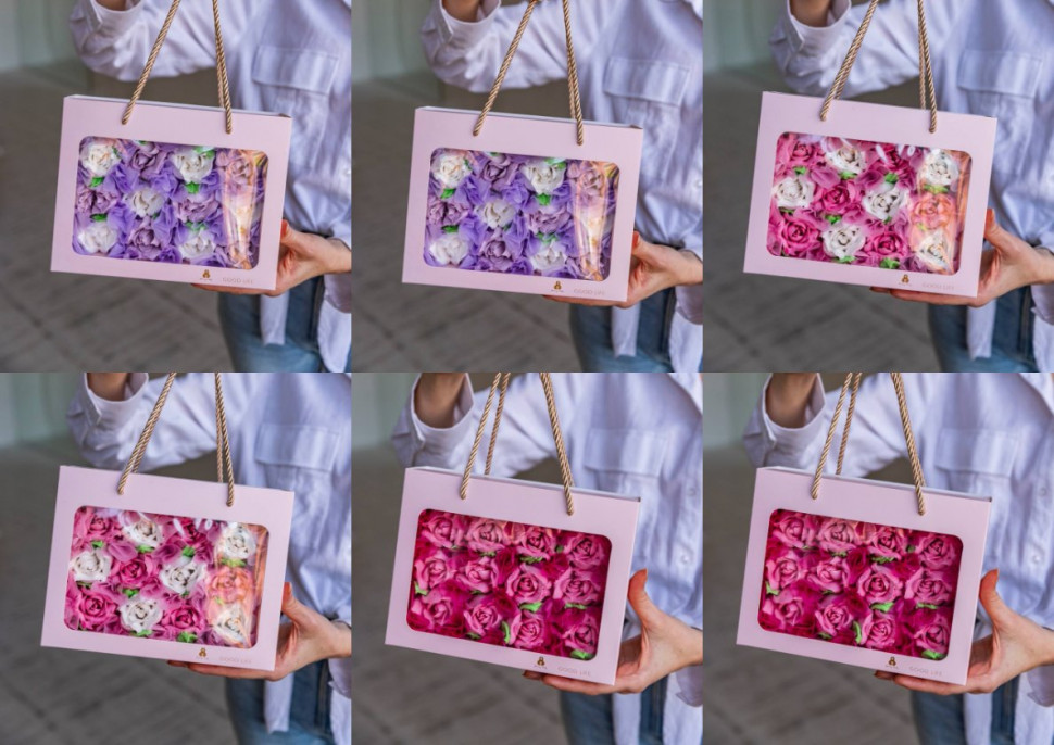Сумки с экраном с зефирными цветами коробка Ассорти 6шт (бело-розовые, бело-фиолетовые, розовые)