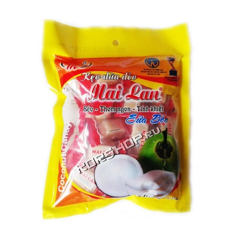 Вьетнамские кокосовые конфеты Май Лан/ MAI LAN LA DUA – традиционная натуральная сладость из Вьетнама, мягкие и тягучие, сливочные с кусочками кокоса.