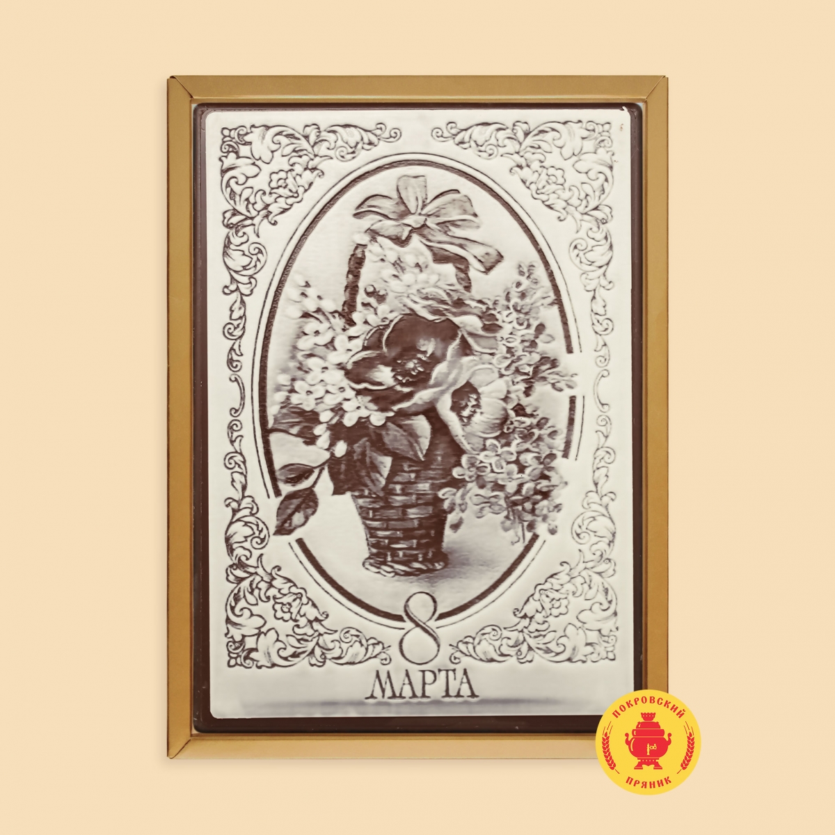 Традиционное тесто, изготовленное и выпеченное  по старинным русским рецептам, покрывается слоем шоколадной глазури «Премиум» класса на которую наносится тематический рисунок, а Внутрь толстый слой начинки из вареной сгущенки и грецких орехов, такой характерный  для Покровского пряника.
