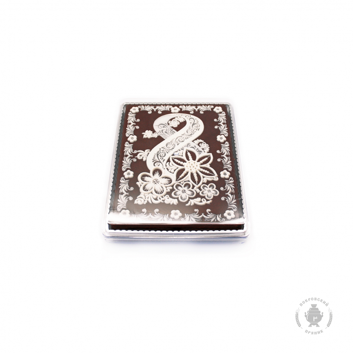 Традиционное тесто, изготовленное и выпеченное  по старинным русским рецептам, покрывается слоем шоколадной глазури «Премиум» класса на которую наносится тематический рисунок, а Внутрь толстый слой начинки из вареной сгущенки и грецких орехов, такой характерный  для Покровского пряника.