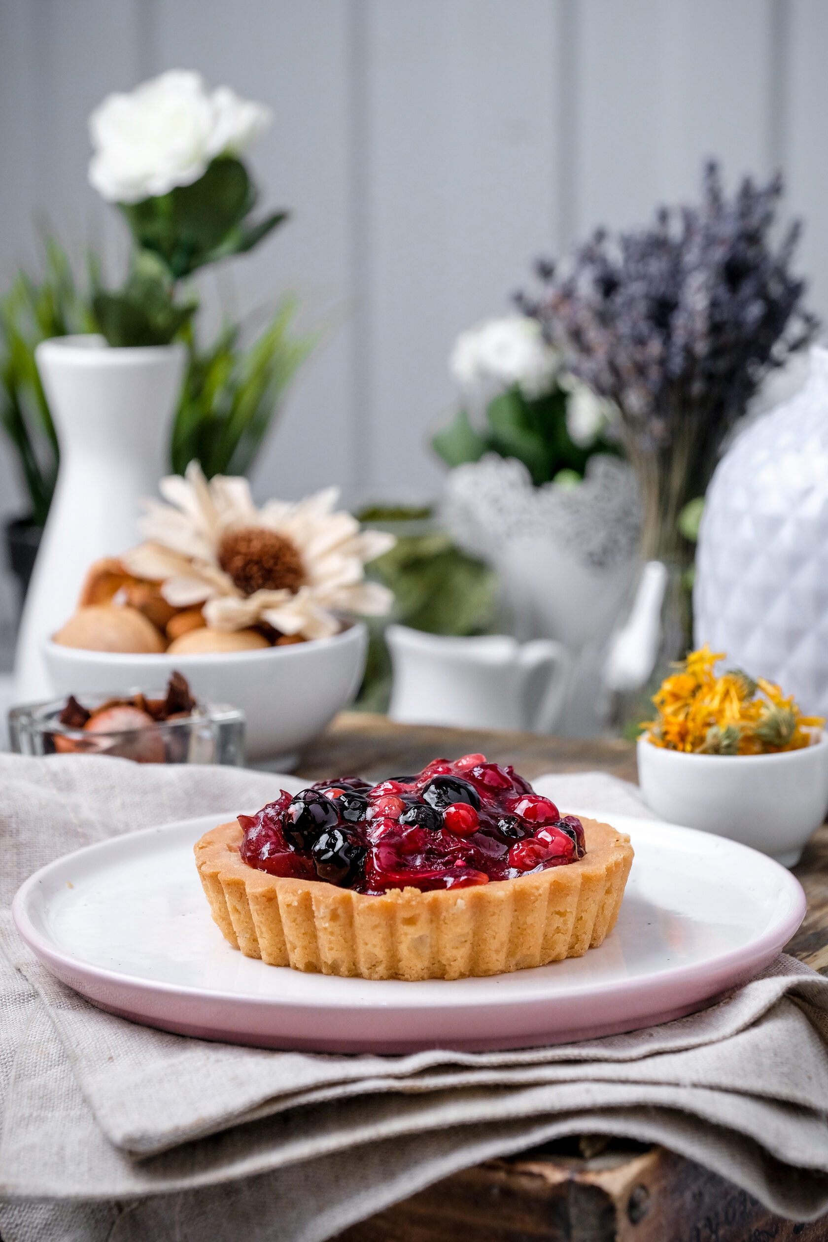 "Нежная корзиночка с ягодами вишни, черной смородины, брусники в клубничном конфитюре на творожном креме.