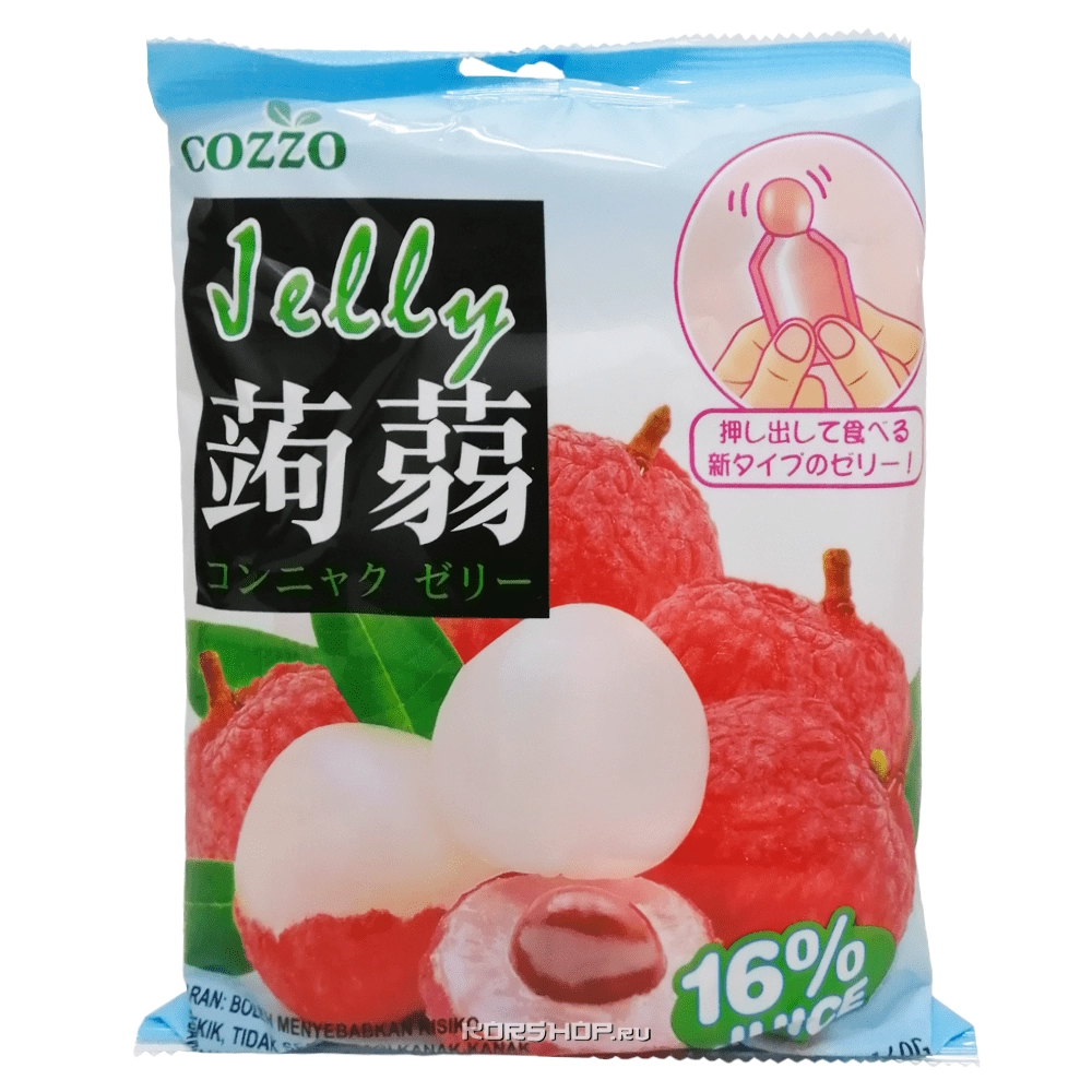 Желе Конняку со вкусом личи от торговой марки Cozzo – это находка для любителей низкокалорийных десертов. Он прекрасно усваивается, и его можно есть без вреда для фигуры. Лакомство изготавливается на основе натурального фруктового сока и является источником витаминов.