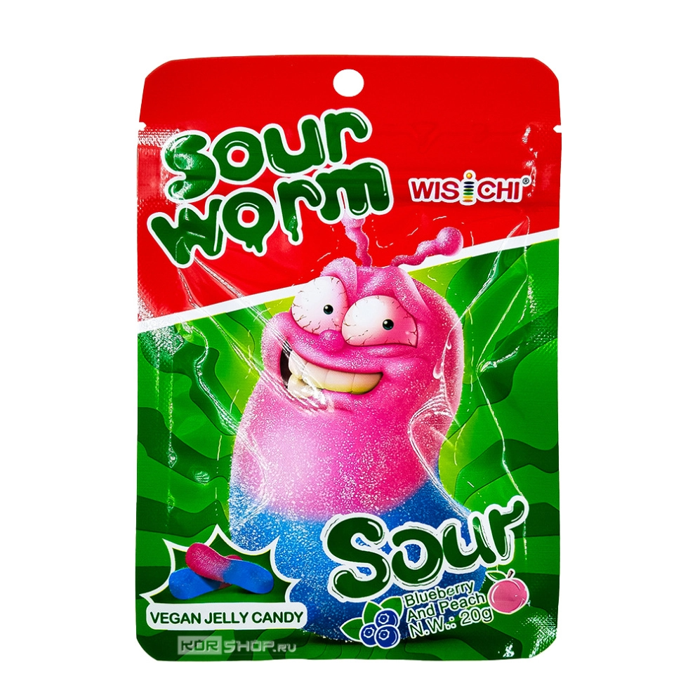 Жевательный мармелад со вкусом персика и черники «Кислый червячок» Sour Worm Wisichi, Китай, 20 г