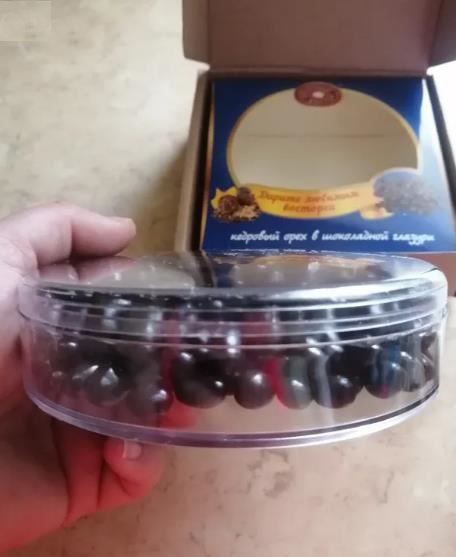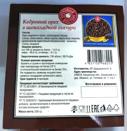 Состав: ядро кедрового ореха, шоколадная глазурь (сахар, какао масло, какао тертое, лецитин, ароматизатор ванилин), глянец пищевой.