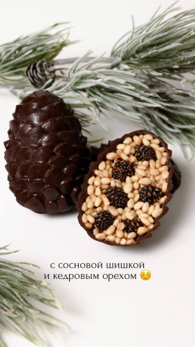 Объемная фигурка из формового горького шоколада в форме кедровой шишки (размер 11*6,5*6,5 см), внутри уникальная начинка из цельного обжаренного ядра кедрового ореха и вяленной таежной брусники.