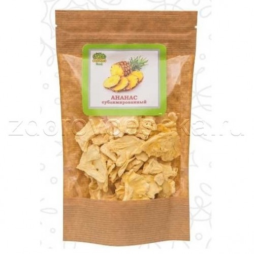 Натуральный ананас, высушенный способом сублимации. Сохранил при этом все полезные вещества, витамины и микроэлементы.