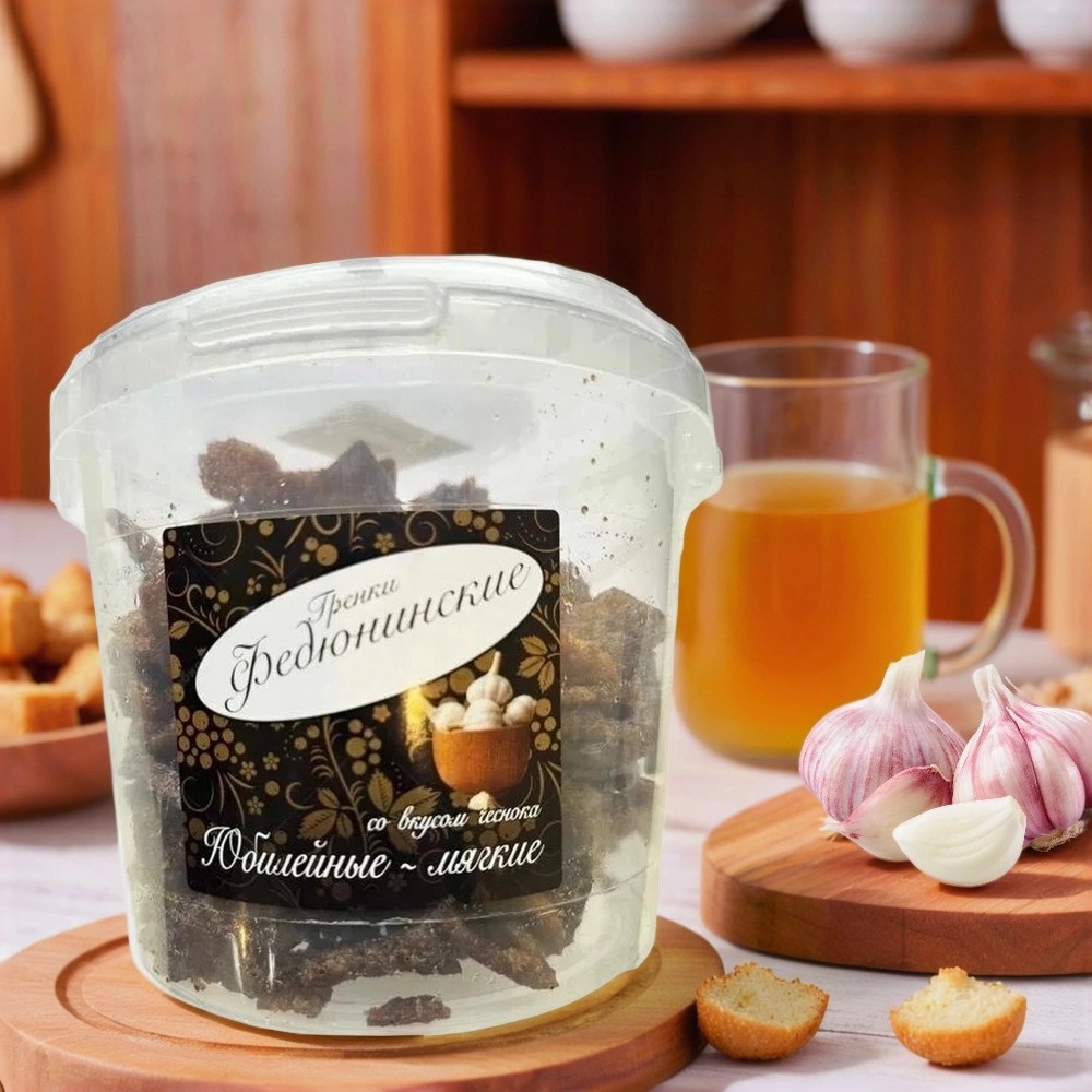 Гренки Федюнинские со вкусом чеснока — мягкая и сочная закуска с насыщенным, характерным чесночным вкусом, органично вписанным в традиции русской кухни. Их аромат отлично дополняет классические блюда, например, такие гренки прекрасно подойдут как добавка к борщу или другим наваристым супам, придавая трапезе особый домашний колорит.