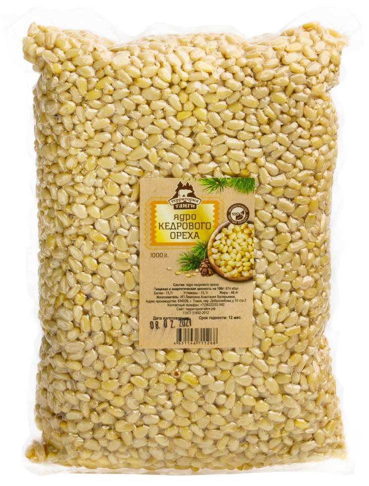 Артикул: 41140; Вес: 1.01 кг; Cрок годности: 12 месяцев; Состав: Ядро кедрового ореха высшего сорта.; Условия хранения: Хранить при температуре от -20 до 20 градусов и относительной влажности воздуха не более 70%.; Пищевая и энергетическая ценность на 100 г: 673 ккал, белки 11,6 г, жиры 61 г, углеводы 19,3 г.