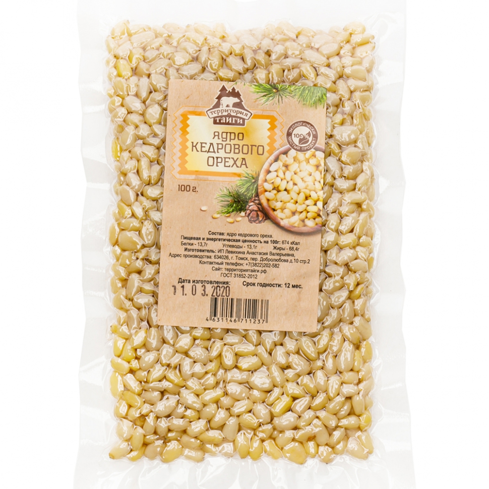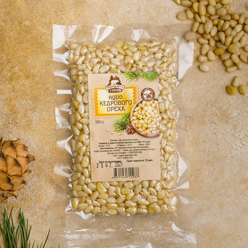 Артикул: 38140; Кол-во в месте: 20 шт.; Вес: 0.11 кг; Cрок годности: 12 месяцев; Состав: Ядро кедрового ореха высшего сорта.; Условия хранения: Хранить при температуре от -20 до 20 градусов и относительной влажности воздуха не более 70%.; Пищевая и энергетическая ценность на 100 г: 673 ккал, белки 11,6 г, жиры 61 г, углеводы 19,3 г.