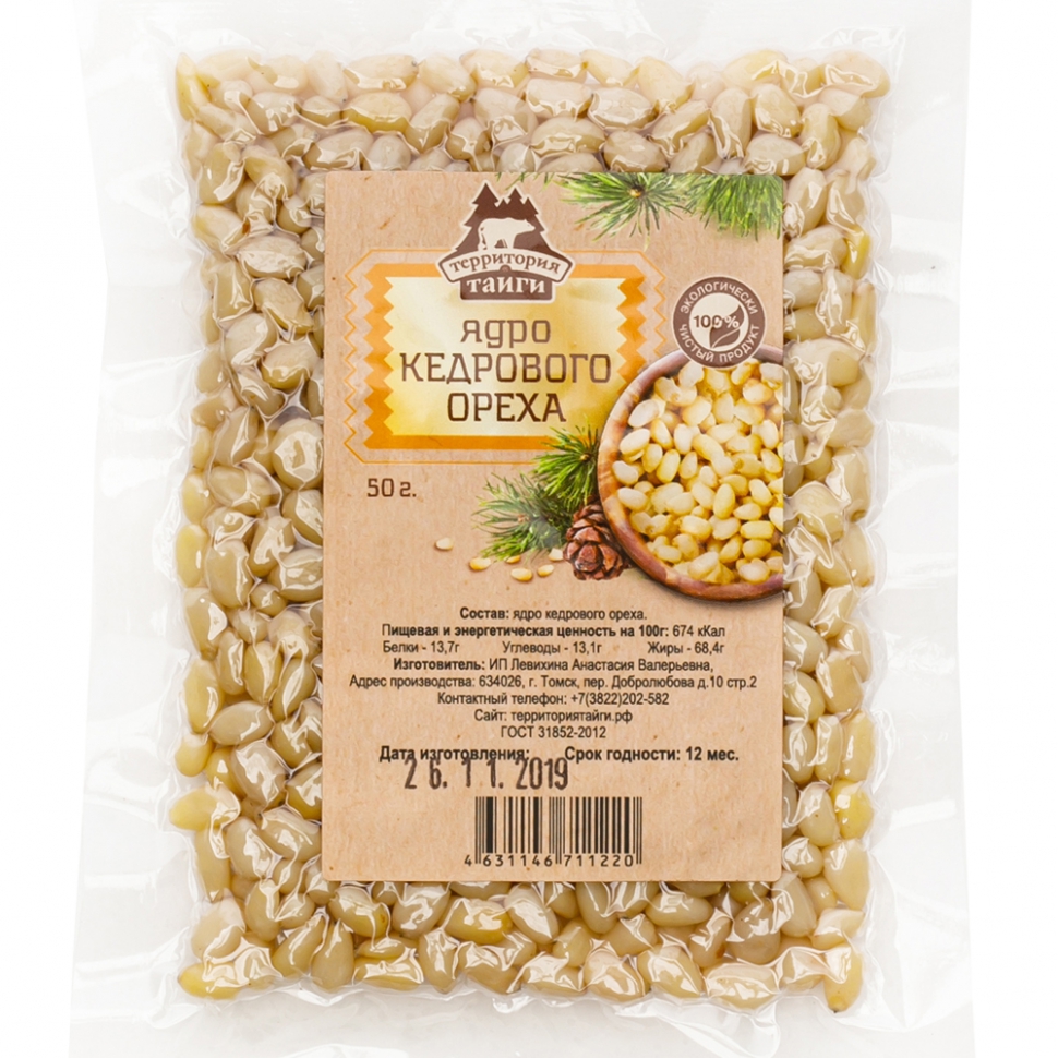 Артикул: 37140; Кол-во в месте: 20 шт.; Вес: 0.06 кг; Cрок годности: 12 месяцев; Состав: Ядро кедрового ореха высшего сорта.; Условия хранения: Хранить при температуре от -20 до 20 градусов и относительной влажности воздуха не более 70%.; Пищевая и энергетическая ценность на 100 г: 673 ккал, белки 11,6 г, жиры 61 г, углеводы 19,3 г.