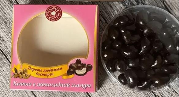 Состав:Ядро кешью, Шоколадная глазурь (сахар, какао масло, какао тертое, лецитин, ароматизатор ванилин), глянец пищевой.