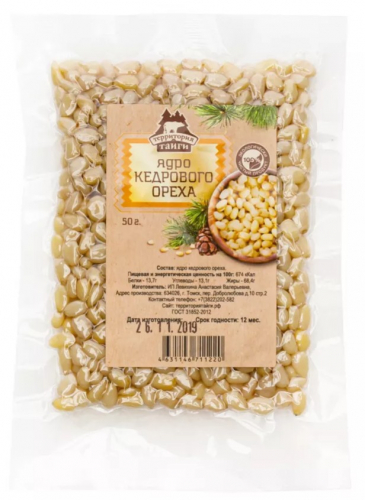 Cрок годности: 12 месяцев; Состав: Ядро кедрового ореха высшего сорта.; Условия хранения: Хранить при температуре от -20 до 20 градусов и относительной влажности воздуха не более 70%.; Пищевая и энергетическая ценность на 100 г: 673 ккал, белки 11,6 г, жиры 61 г, углеводы 19,3 г.