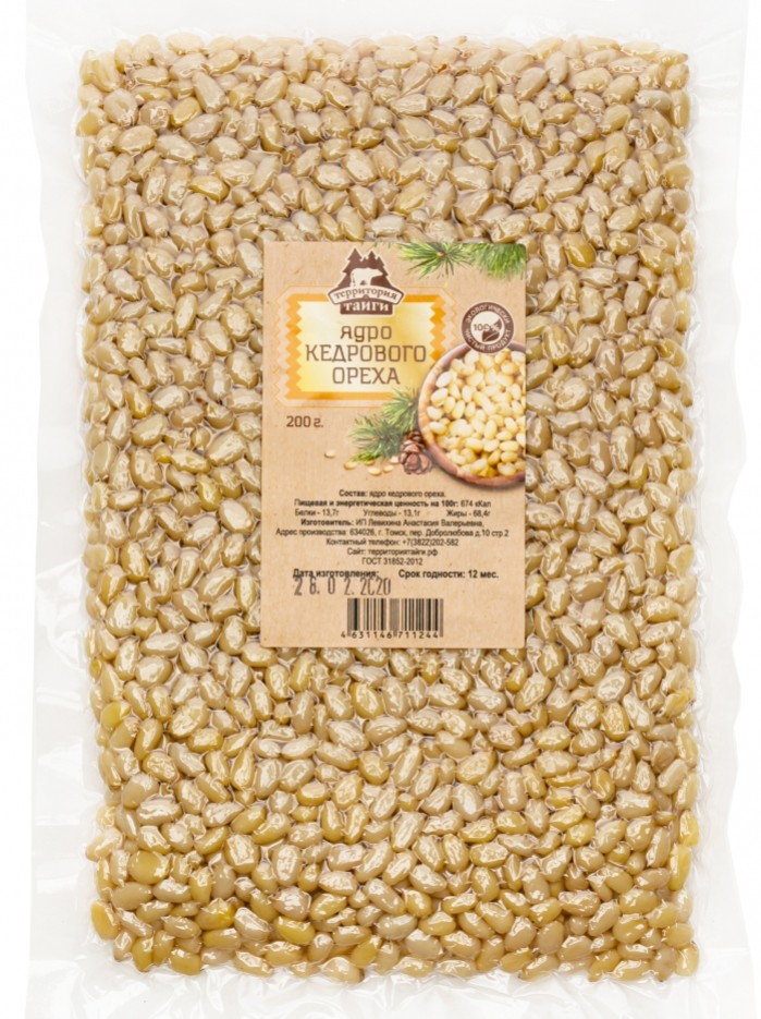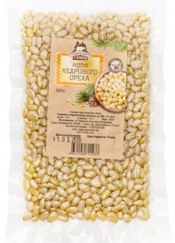 Cрок годности: 12 месяцев; Состав: Ядро кедрового ореха высшего сорта.; Условия хранения: Хранить при температуре от -20 до 20 градусов и относительной влажности воздуха не более 70%.; Пищевая и энергетическая ценность на 100 г: 673 ккал, белки 11,6 г, жиры 61 г, углеводы 19,3 г.