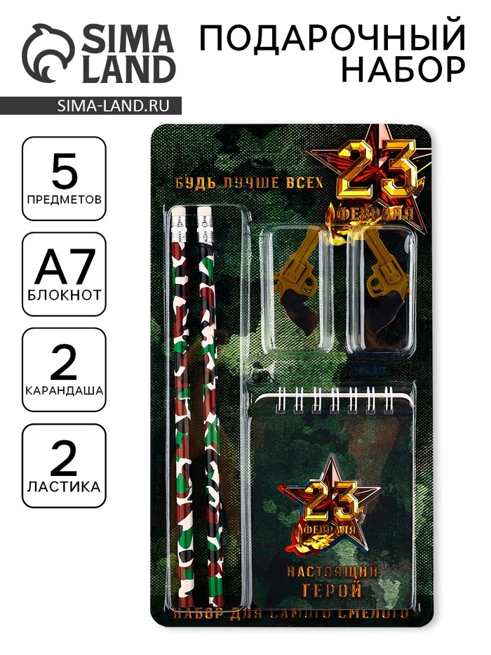 Подарочный набор канцелярский, ластики 2 шт., блокнот, карандаши «День настоящих героев. 23 февраля«»