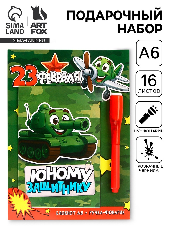 Подарочный набор «Юному защитнику», ручка с фонариком и невидимыми чернилами, блокнот А6, 16 л