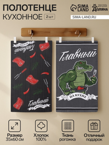 Набор полотенец кухонных «Доляна. Главный на кухне», 35×60 см - 2 шт., рогожка, хлопок 100%, 160 г/м²