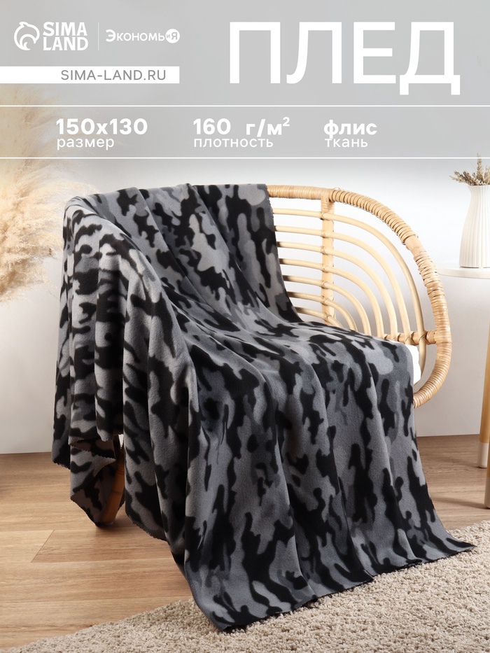 * Стильный и мужественный серый камуфляжный принт: Сочетание серого цвета и камуфляжного узора придает пледу современный и брутальный вид.