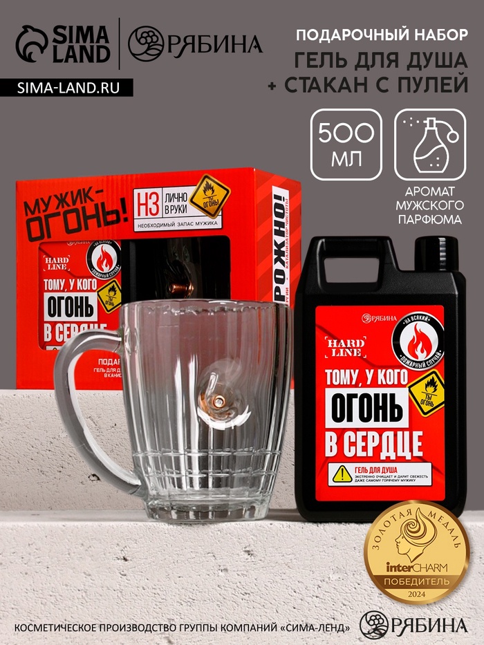 Подарочный набор «Мужику огонь», гель для душа канистра 500 мл и стакан с пулей, HARD LINE