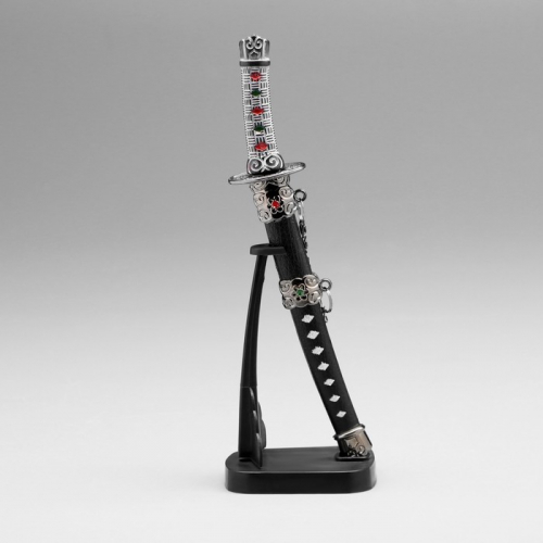 Откройте для себя уникальный элемент декора, который привнесет в ваш интерьер атмосферу восточной культуры — сувенирная катана на подставке. Элегантная и стильная, она станет не только изысканным украшением, но и оригинальным подарком для ценителей восточного искусства. С длиной лезвия 11,5 см и ножнами, оформленными в черном цвете с красными ромбами, эта катана привлекает внимание и восхищает своим дизайном.