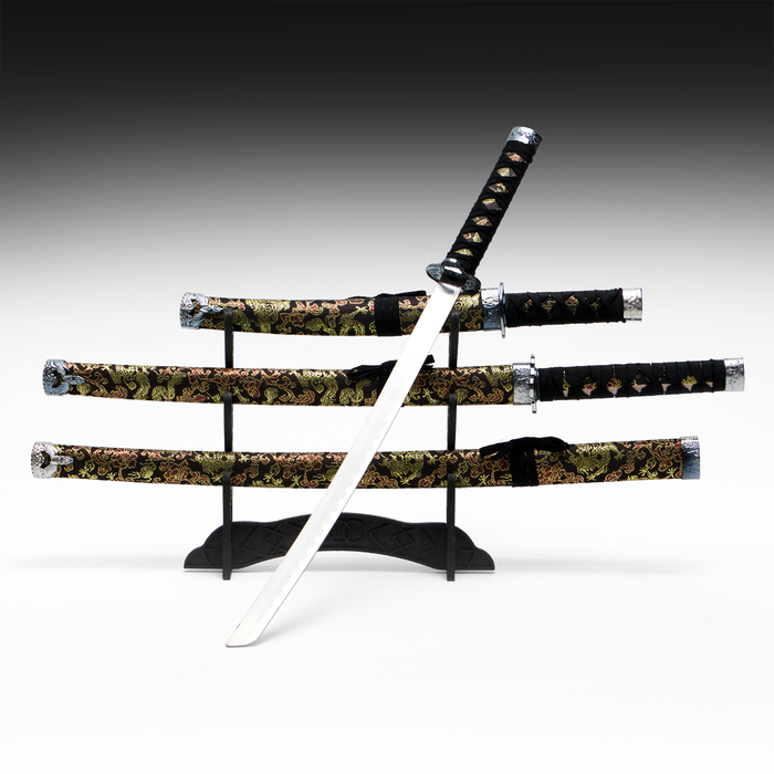 Макет оружия «Сувенирные катаны на подставке 3в1. Драконы на чёрном», подарочный набор, ножны ткань, 47 см; 70 см; 89 см