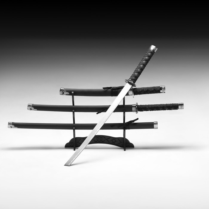 Этот набор из трёх декоративных катан — строгое и сдержанное решение для кабинета или коллекции. Комплект с подставкой передаёт дух традиционного оружия, создавая завершённую композицию.