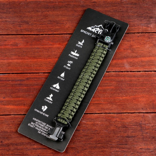 Браслет для выживания 4 в1 (паракорд, компас, свисток, огниво), 25.5×2.5 см, 3 м, тёмно-зелёный