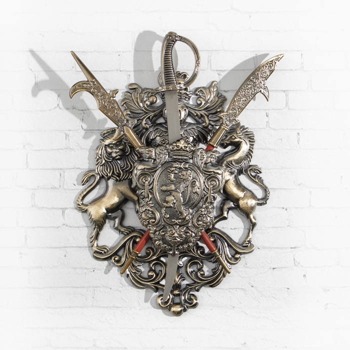 Панно с изображением льва на щите и двумя шпагами — это великолепный элемент декора, который привнесет в ваш интерьер нотку благородства и силы. Выполненное в золотистых, серебристых и бронзовых оттенках, это настенное украшение станет ярким акцентом в любом помещении, подчеркивая вашу индивидуальность и стиль.