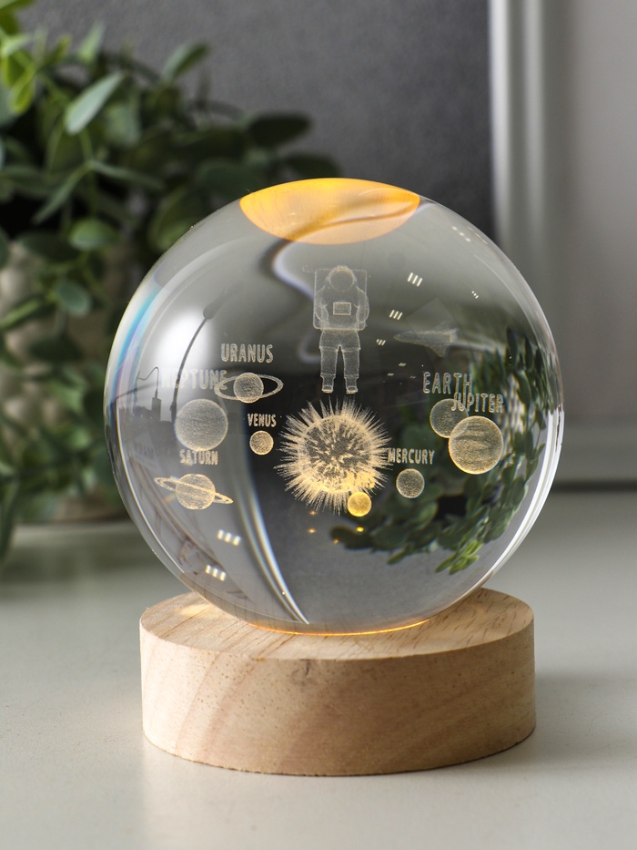 Световая фигурка стекло «Шар. Голограмма: Космонавт и планеты», d=8 см, подставка дерево, USB, 8×8×9.5 см