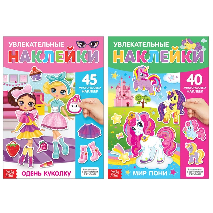 Набор многоразовых детских наклеек включает в себя 2 издания разной тематики: «Одень куколку» и «Мир пони». Превращайте обучение в увлекательную игру, меняйте наряды для куколок и заселяйте волшебный мир пони сказочными существами.