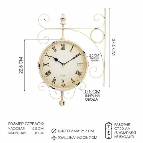 Часы имеют 2 циферблата: один с римскими, другой с арабскими цифрами. Дискретный ход двух надежных кварцевых механизмов осуществляется за счет пальчиковых батарей типа АА.( по одной в каждый механизм). Настенные часы устанавливаются на боковой подвес к стене. Часы настенные станут прекрасным сувениром на День рождения. Они с удивительной легкостью обогатят любой интерьер уютом. Каждому хозяину периодически приходит мысль обновить свою квартиру, сделать ремонт, перестановку или кардинально поменять внешний вид каждой комнаты. Часы настенные - привлекательная деталь, которая поможет воплотить вашу интерьерную идею, создать неповторимую атмосферу в вашем доме. Окружите себя приятными мелочами, пусть они радуют глаз и дарят гармонию.