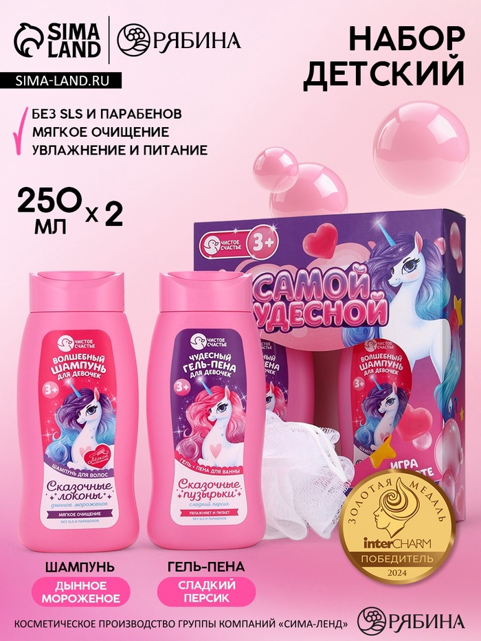 Набор детский «Самой чудесной», гель-пена 250 мл, шампунь 250 мл, мочалка 25 г, Чистое счастье