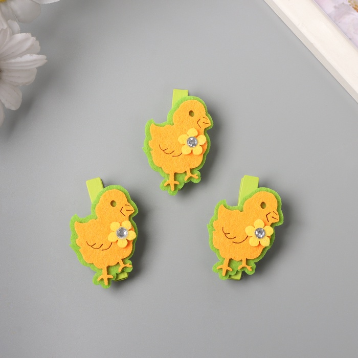 Декор для творчества дерево, фетр «Прищепка. Цыплёнок с цветочком», набор 3 шт. 1.8×3×5.1 см