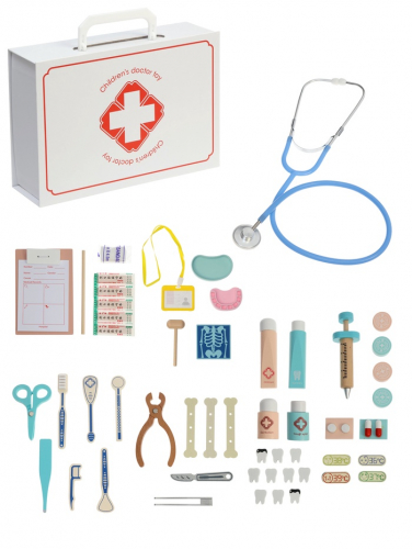 * Большая комплектация: инструменты стоматолога, карточки пациента, лекарства, зубы, рентген, стетоскоп и аксессуары для осмотра.