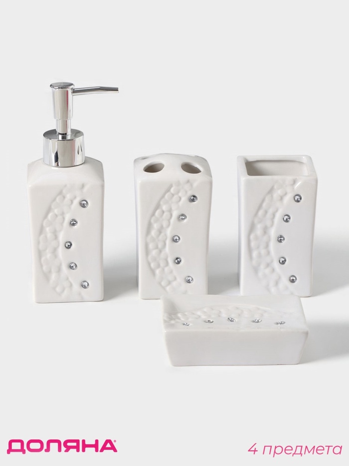 Аксессуары для ванной Доляна «Цветочный барельеф», 4 предмета, дозатор 270 мл, мыльница, 2 стакана 210 мл, белые