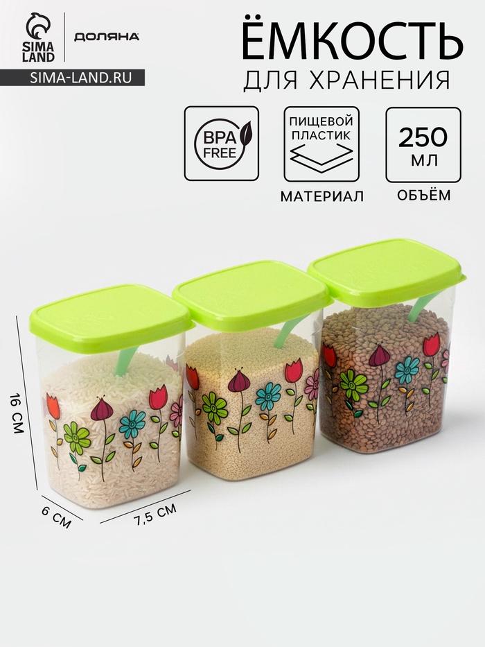 Банки для хранения сыпучих с ложками Доляна «Клумба», набор 3 шт., 250 мл, пластик, МИКС